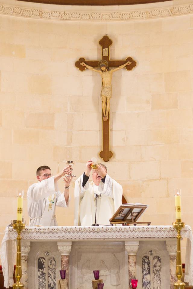 Fr. Bob and Deacon Cronin, elevate the chalice and host in the Church of the workshop of St. Joseph, Nazareth