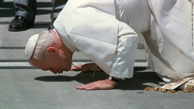 Pope John Paul II kisses the ground upon his arrival in Auckland airport on the fourth leg of a six-nation tour 22 November 1986. AFP PHOTO JEAN-CLAUDE DELMAS (Photo credit should read JEAN-CLAUDE DELMAS/AFP/Getty Images)