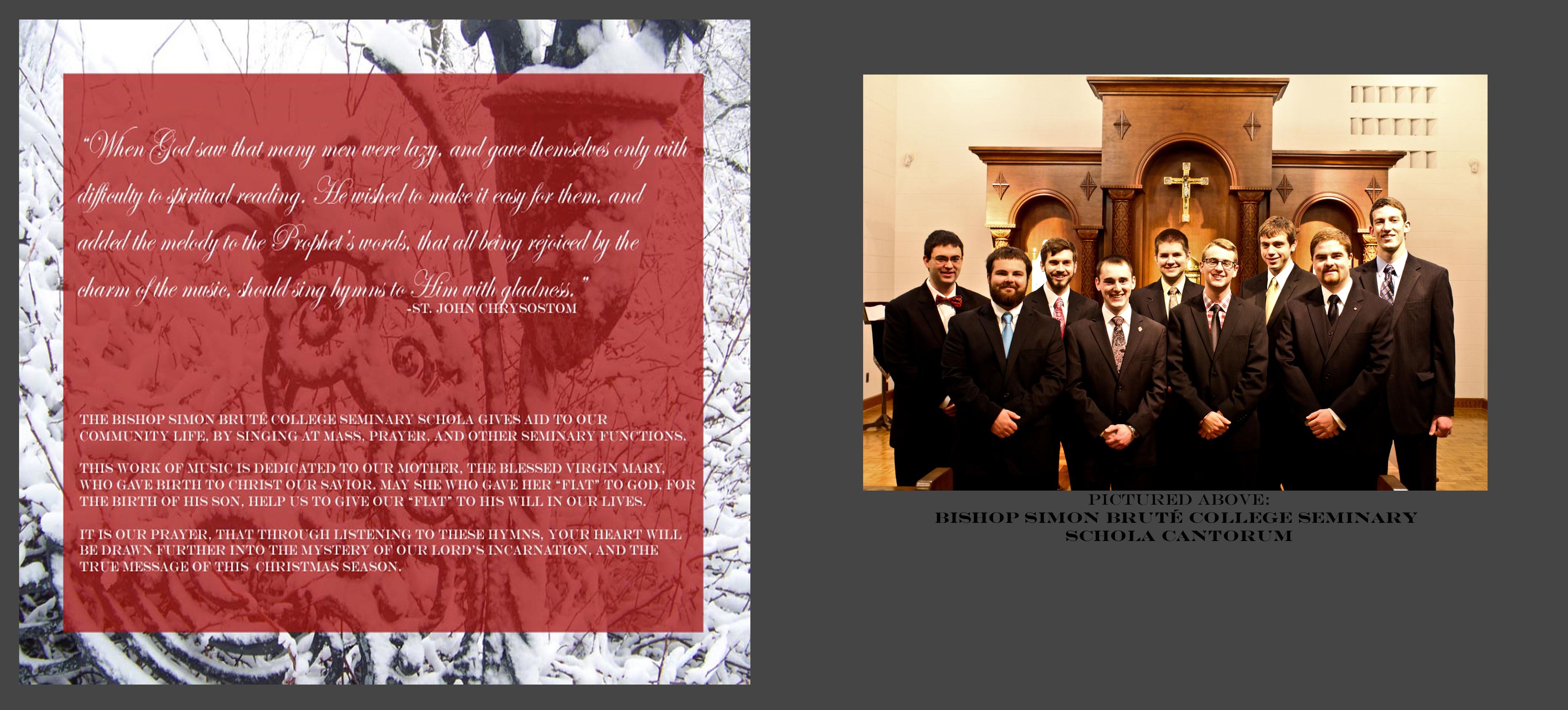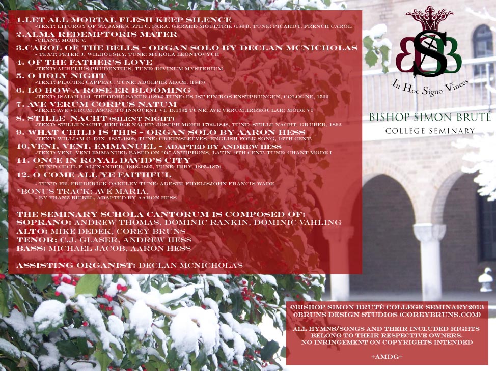 I recorded, digitally edited audio of the Schola singing, as well as designed the case and CD. I also worked with choosing the hymns and chants that would be burned. The CD’s came plastic wrapped, with the audio filed burned on each one. They were sold not for profit: $5 each.